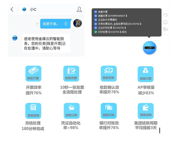 2.接入AI交互服務,智能財務機器人小K提供AI語音服務基礎設施、開票服務、銷售及庫存查詢服務和發(fā)票智能接收等服務,引領財務機器人2.0時代。