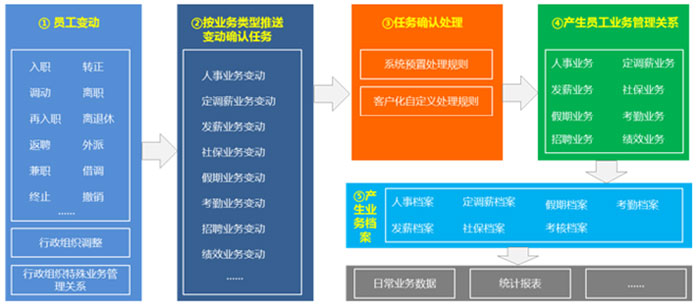 一旦前端業(yè)務(wù)(如員工變動(dòng))發(fā)生,金蝶s-HRV8.5會(huì)自動(dòng)向后續(xù)薪酬、社保、假勤、績(jī)效模塊推送變動(dòng)確認(rèn)任務(wù),自動(dòng)按預(yù)定規(guī)則重新建立員工業(yè)務(wù)管理關(guān)系,保證員工工作崗位和角色發(fā)生變化時(shí),其他HR業(yè)務(wù)能夠隨之自動(dòng)發(fā)生變化,從而消除HR各職能間不能及時(shí)有效聯(lián)動(dòng)的問(wèn)題,提高HR工作的流暢度,減少員工因工作崗位發(fā)生變動(dòng),很多人事服務(wù)不能自動(dòng)接續(xù)而產(chǎn)生的抱怨。
