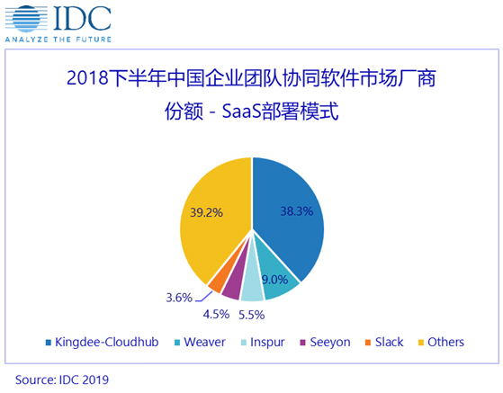 6月10日,全球知名信息技術(shù)咨詢公司IDC發(fā)布新《2018年下半年中國(guó)企業(yè)團(tuán)隊(duì)協(xié)同軟件市場(chǎng)跟蹤報(bào)告》。報(bào)告顯示,中國(guó)企業(yè)采用SaaS協(xié)同軟件的復(fù)合增長(zhǎng)率為35.3%,增速遠(yuǎn)高于傳統(tǒng)部署模式,到2023年,SaaS模式的企業(yè)團(tuán)隊(duì)協(xié)同軟件市場(chǎng)份額將上升為31.8%。目前,金蝶云之家(Kingdee-Cloudhub)是中國(guó)企業(yè)團(tuán)隊(duì)協(xié)同SaaS軟件市場(chǎng)的領(lǐng)導(dǎo)品牌,市場(chǎng)份額為38.3%排名,超過(guò)第二名至第五名的總和。