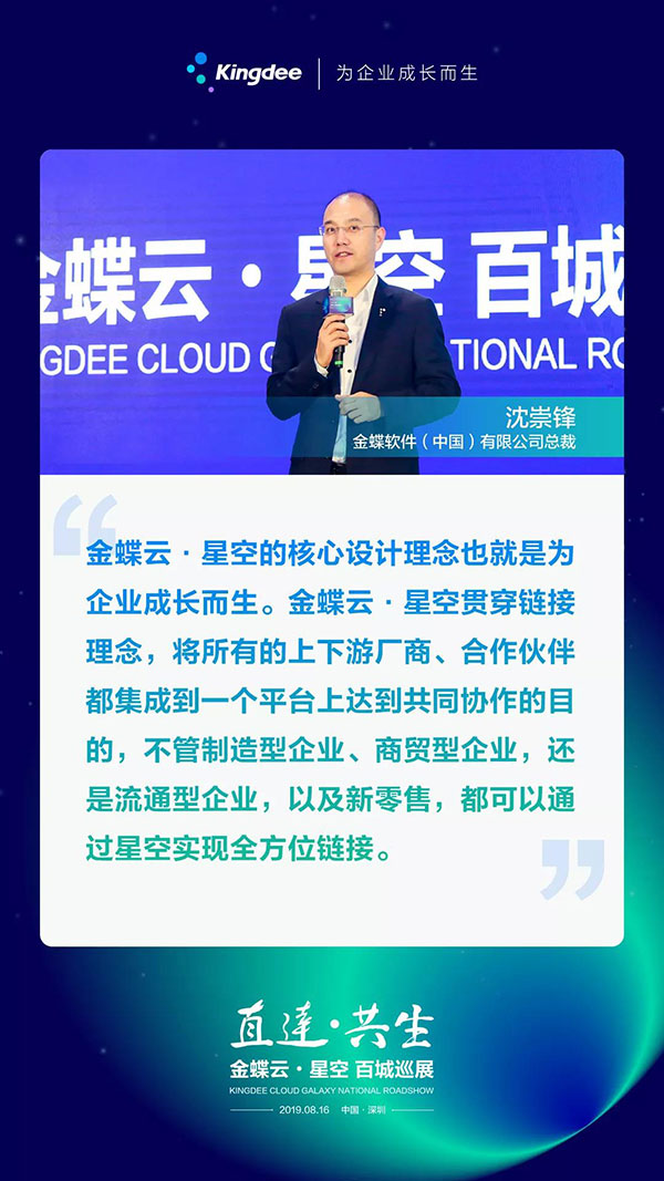 金蝶云·星空百城巡展正式開啟,將聯(lián)合業(yè)內(nèi)專家,由深圳出發(fā),為更多地域、更多的企業(yè)家?guī)砥髽I(yè)上云精彩內(nèi)容分享,助力中國企業(yè)上云。除此之外,金蝶于9月6日在北京舉辦“金蝶云蒼穹高峰論壇”首站——北京站;10月20日在北京舉辦“2019金蝶云全球用戶大會”。